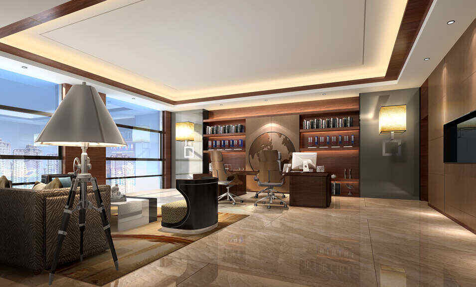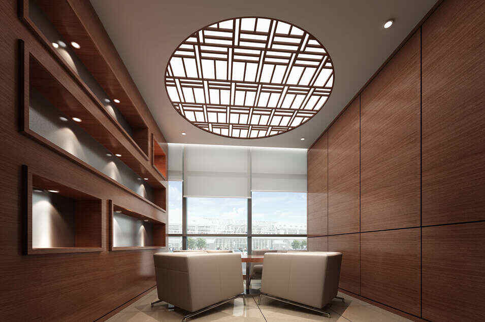 設(shè)計(jì)介紹:現(xiàn)代簡約凝重風(fēng)如何展現(xiàn)?設(shè)計(jì)師們運(yùn)用棕色的色調(diào)表現(xiàn)出凝重感,頂部圓形中國風(fēng)網(wǎng)狀帶有悠久的中國藝術(shù),天圓地方設(shè)計(jì),使人一進(jìn)入到這個(gè)辦公室給人與專業(yè)、理性的感覺,這點(diǎn)特別符合公司的企業(yè)文化。