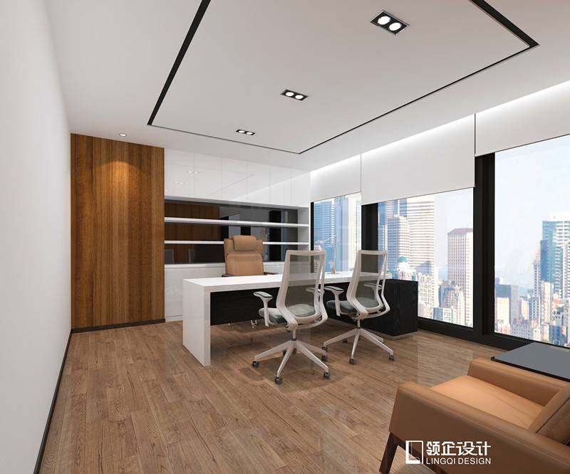 辦公室裝修效果圖獨立辦公室:依舊是白色吊頂,黑色不銹鋼包邊的設計。在深色花紋地毯的襯托下,拋掉可能出現的“頭重腳輕”的不和諧;與現代設計的一般獨立辦公室不同,這次設計師采用了胡桃木絲帶和條紋的木制家具,書桌,頂層擱板和古董擱板作為背景板,休息區的小茶幾,甚至連員工椅和待客沙發都被煞費苦心地定制成了木頭、布料和皮革的組合版。但是,不得不說,搭配上小木桌上的淑女造型臺燈,整個辦公室的穩重優雅很有意思。