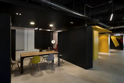 這套工業風辦公樓設計采用了大量的黑色工業風元素不僅頂面是黑色工業的吊頂而且隔斷墻也都采用了黑色工業風格,為了緩解辦公空間壓抑氣氛,辦公室裝修公司設計師采用了一些亮色的家具打破沉悶的氣氛,員工休息室也以明亮活力多彩為主,辦公室黑色隔墻墻是員工的充滿藝術感的抽象畫作,整個辦公室空間很強的工業風,地面是做的環氧地坪地面。
